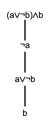 This rule splits a branch into two, differing only for the final node. Since branches are considered in disjunction to each other, the two resulting branches are equivalent to the original one, as the disjunction of their non-common nodes is precisely . The rule for disjunction is generally formally written using the symbol for separating the formulae of the two distinct nodes to be created: