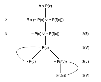 As an example, can be proved unsatisfiable by first generating ; the negation of this literal is unifiable with , the most general unifier being the substitution that replaces with ; applying this substitution results in replacing with , which closes the tableau.