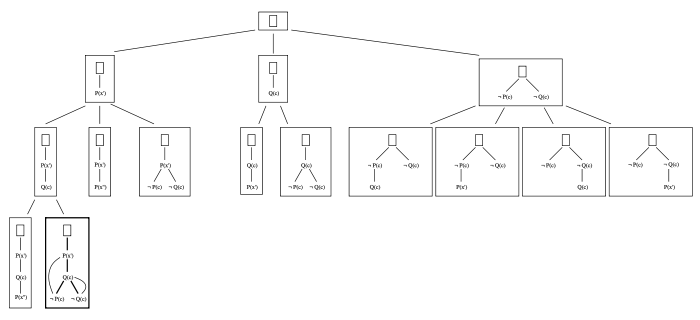 The rule for universal quantifiers is the only non-deterministic rule, as it does not specify which term to instantiate with. Moreover, while the other rules need to be applied only once for each formula and each path the formula is in, this one may require multiple applications. Application of this rule can however be restricted by delaying the application of the rule until no other rule is applicable and by restricting the application of the rule to ground terms that already appear in the path of the tableau. The variant of tableaux with unification shown below aims at solving the problem of non-determinism.