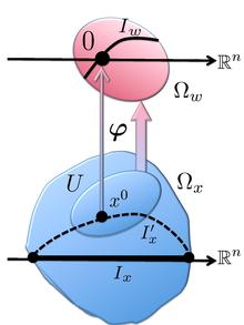 First, we deform the contour Ix into a new contour passing through the saddle point x0 and sharing the boundary with Ix. This deformation does not change the value of the integral I(λ). We employ the Complex Morse Lemma to change the variables of integration. According to the lemma, the function φ(w) maps a neighborhood x0 ∈ U ⊂ Ωx onto a neighborhood Ωw containing the origin. The integral I(λ) can be split into two: I(λ) = I0(λ) + I1(λ), where I0(λ) is the integral over , while I1(λ) is over (i.e., the remaining part of the contour I′x). Since the latter region does not contain the saddle point x0, the value of I1(λ) is exponentially smaller than I0(λ) as λ → ∞;[5] thus, I1(λ) is ignored. Introducing the contour Iw such that , we have