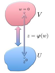 The Morse lemma for real-valued functions generalizes as follows[2] for holomorphic functions: near a non-degenerate saddle point z0 of a holomorphic function S(z), there exist coordinates in terms of which S(z) − S(z0) is exactly quadratic. To make this precise, let S be a holomorphic function with domain W ⊂ Cn, and let z0 in W be a non-degenerate saddle point of S, that is, ∇S(z0) = 0 and . Then there exist neighborhoods U ⊂ W of z0 and V ⊂ Cn of w = 0, and a bijective holomorphic function φ : V → U with φ(0) = z0 such that