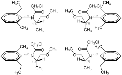 Metolachlor is a popular herbicide in the United States.[3] As originally formulated metolachlor was applied as a racemate, a 1:1 mixture of the (S)- and (R)-stereoisomers. The (R)-enantiomer is less active, and modern production methods afford a higher concentration of S-metolachlor, thus current application rates are far lower than original formulations.