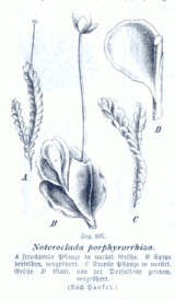 A more thorough understanding of the Metzgeriales was not achieved until the morphological and developmental work of Leitgeb in the late nineteenth century.[13] Leitgeb was among the first to recognize and appreciate the significance of development and reproductive morphology as a guide to distinguishing liverwort groups. His careful examinations guided revisions made in the classification published from 1893 to 1895 by Schiffner in Engler and Prantl.[16] Schiffner thus divided his "Jungermanniales" into two broad groups according to whether the archegonia were terminal on reproductive branches (Jungermanniales akrogynae) or sub-terminal (Jungermanniales anakrogynae). This latter group included what are now recognized as the Metzgeriales, Sphaerocarpales, and Haplomitriales.