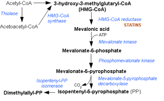 Mevalonate is a key intermediate, and mevalonate kinase a key early enzyme, in isoprenoid and sterol synthesis.[6] As the second enzyme in the Mevalonate pathway, it catalyzes the phosphorylation of Mevalonic acid to produce Mevalonate-5-phosphate.[8] A 5-10% reduction in mevalonate kinase activity is associated with the mevalonate kinase deficiency (MVD) resulting in accumulation of intermediate mevalonic acid.[9]