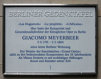 On 9 September 2013 a plaque to mark Meyerbeer's last residence was put up at Pariser Platz 6a, Berlin.[143]