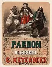 In Paris Meyerbeer had been asked by Louis Véron, the director of the Opéra, for a new work. At first he attempted to persuade Véron to accept the opéra-comique Le portefaix to a libretto by Scribe,[n 3] which he had been contracted to compose in early 1831; but Véron insisted on a full five-act piece. Together with Scribe, Meyerbeer reviewed many subjects before deciding, in 1832, on Les Huguenots. The contract which Meyerbeer signed with Véron contained a penalty clause if the work was not delivered by the end of 1833. When the time came and the opera was not ready, Véron claimed his 30,000 francs under this clause; Meyerbeer was perhaps unique amongst composers in being able to pay this. In fact Véron refunded the money under a further agreement, when the opera was delivered in late 1834; but Veron himself was replaced as director of the Opera by Henri Duponchel before Les Huguenots was premiered on 29 February 1836.[41] It was an immediate and immense success, its splendid staging and effects exceeding even those of Fromental Halévy's La Juive, which had premiered the previous year.[42] Berlioz called the score "a musical encyclopaedia", and the singing, especially of Nourrit and Falcon, was universally praised.[43] Les Huguenots was the first opera to be performed at the Opéra more than 1,000 times (the 1,000th performance being on 16 May 1906)[44] and continued to be produced up to 1936, more than a century after its premiere.[45] Its many performances in all other of the world's major opera houses give it a claim to being the most successful opera of the 19th century.