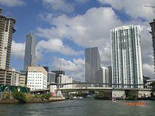 The Miami River is a river in the United States state of Florida that drains out of the Everglades and runs through the city of Miami, including Downtown. The 5.5-mile (8.9 km) long river flows from the terminus of the Miami Canal at Miami International Airport to Biscayne Bay. It was originally a natural river inhabited at its mouth by the Tequesta Indians, but it was dredged and is now polluted throughout its route through Miami-Dade County. The mouth of the river is home to the Port of Miami and many other businesses whose pressure to maintain it has helped to improve the river's condition.