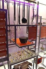 Faraday invented an early form of what was to become the Bunsen burner, which is in practical use in science laboratories around the world as a convenient source of heat.[32][33] Faraday worked extensively in the field of chemistry, discovering chemical substances such as benzene (which he called bicarburet of hydrogen) and liquefying gases such as chlorine. The liquefying of gases helped to establish that gases are the vapours of liquids possessing a very low boiling point and gave a more solid basis to the concept of molecular aggregation. In 1820 Faraday reported the first synthesis of compounds made from carbon and chlorine, C2Cl6 and C2Cl4, and published his results the following year.[34][35][36] Faraday also determined the composition of the chlorine clathrate hydrate, which had been discovered by Humphry Davy in 1810.[37][38] Faraday is also responsible for discovering the laws of electrolysis, and for popularizing terminology such as anode, cathode, electrode, and ion, terms proposed in large part by William Whewell.[39]
