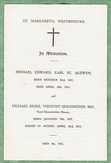 Hicks-Beach fought in the First World War as a Captain with the 1/1st Royal Gloucestershire Hussars and died, aged 39, on 23 April 1916 as a result of wounds received at Katia, Egypt. He is buried at the Cairo New British Protestant Cemetery alongside his wife.[1] Viscount Quenington is commemorated on Panel 8 of the Parliamentary War Memorial in Westminster Hall, one of 22 MPs that died during World War I to be named on that memorial.[2][3] Viscount Quenington is one of 19 MPs who fell in the war who are commemorated by heraldic shields in the Commons Chamber.[4] A further act of commemoration came with the unveiling in 1932 of a manuscript-style illuminated book of remembrance for the House of Commons, which includes a short biographical account of the life and death of Viscount Quenington.[5][6]