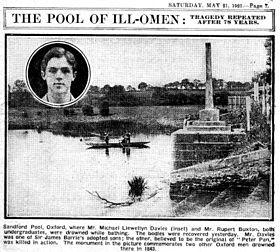 The closeness of Davies and Buxton, combined with the uncertain circumstances of their deaths, led to speculation that the pair had died in a suicide pact. Dangerous currents in Sandford Lasher had made the pool notorious as a drowning hazard – there were warning signs and a conspicuous 19th century memorial to previous victims. Despite this, the pair had gone swimming there before.