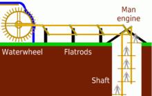 Inspired by the German designs and constructed of a series of moving platforms, the first man engine was installed in 1842 at Tresavean Mine—one of the deepest in Cornwall at the time.[2] Its adoption was encouraged by the mine's owner, John Rogers.