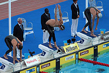 At the 2005 World Aquatics Championships, Phelps won a total of six medals, 5 golds and one silver.[73] In the 400-meter freestyle, Phelps did not make it past the preliminary heats and finished 18th overall with a time of 3:50.53.[74] Later that day, in the 4×100-meter freestyle relay, Phelps won his first gold in the Championships.[75] Two days later, on July 26, Phelps won his second gold in the 200-meter freestyle with a new American record time of 1:45.20, finishing ahead of Grant Hackett.[76] Two days later, on July 28, Phelps finished seventh in the 100-meter freestyle final.[77] Later that day, Phelps won his third gold in the 200-meter individual medley.[78] On July 29, Phelps, along with Ryan Lochte, Peter Vanderkaay and Klete Keller, won the gold in the 4×200-meter freestyle relay with a time of 7:06.58. This was the fourth gold medal for Phelps.[79] On July 30, Phelps swam in his last individual event, the 100-meter butterfly. In the final, Phelps could not match the speed of Ian Crocker and had to settle for silver, finishing 51.65 to 50.40.[80] On July 31, Phelps earned his final gold medal when the United States team won the 4×100-meter medley relay.[81] Phelps did not swim in the finals but still earned a medal because he swam in the heats.[82]