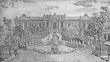 During the second year of his reign in 1737, the Qianlong Emperor commissioned Giuseppe Castiglione to construct multiple European-style pavilions (Xiyanglou) on the grounds of the Old Summer Palace. Michel Benoist oversaw the construction of Castiglione's designs, taking over construction following Castiglione's death in 1766, and helped design multiple parts of the palace.[1] His studies in hydraulics were used for designing various fountains throughout the palace. His greatest achievement was the construction of a "water clock" in front of The Hall of Calm Seas, a building arguably based on the Court of Honor at Versailles.[2][7] The clock consisted of a fountain basin surrounded by 12 statues depicting the animals of the Chinese zodiac, with each zodiac associated with the 12 Chinese hours dictated by the Earthly Branches System. Using a hydraulic system designed by Benoist, each statue spewed water from the mouth of each animal for a consecutive hour, and was among the first water jet systems developed in China.[6][8]