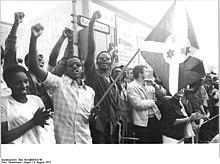 In April 1972, a rebellion broke out among the Hutu at Rumonge in the south at the encouragement of the Tanzanian regime and spread rapidly.[2] In subsequent ethnic violence, as many as 1,000 Tutsi were killed. The response of the Micombero regime was to launch a campaign of genocidal violence against the Hutu in the region in which 100,000 people are thought to have been killed. The deposed king Ntare, said to have led the rebellion, was himself murdered.[2] In 1973, after further violence, Mobutu was forced to intervene to prevent Tanzanian invasion.[2] Following the end of the crisis, Micombero introduced a new constitution allowing him to run for a further seven-year term. He also laid the foundation for the Economic Community of the Great Lakes Countries the same year, along with the governments of Rwanda and Zaire.[2]