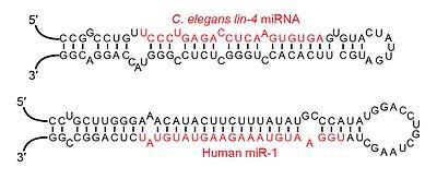 The first miRNA was discovered in 1993 by a group led by Ambros and including Lee and Feinbaum. However, additional insight into its mode of action required simultaneously published work by Ruvkun's team, including Wightman and Ha.[13][31] These groups published back-to-back papers on the lin-4 gene, which was known to control the timing of C. elegans larval development by repressing the lin-14 gene. When Lee et al. isolated the lin-4 miRNA, they found that instead of producing an mRNA encoding a protein, it produced short non-coding RNAs, one of which was a ~22-nucleotide RNA that contained sequences partially complementary to multiple sequences in the 3' UTR of the lin-14 mRNA.[13] This complementarity was proposed to inhibit the translation of the lin-14 mRNA into the LIN-14 protein. At the time, the lin-4 small RNA was thought to be a nematode idiosyncrasy.