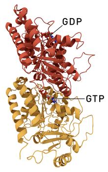 Dynamic instability refers to the coexistence of assembly and disassembly at the ends of a microtubule. The microtubule can dynamically switch between growing and shrinking phases in this region.[29] Tubulin dimers can bind two molecules of GTP, one of which can be hydrolyzed subsequent to assembly. During polymerization, the tubulin dimers are in the GTP-bound state.[12] The GTP bound to α-tubulin is stable and it plays a structural function in this bound state. However, the GTP bound to β-tubulin may be hydrolyzed to GDP shortly after assembly. The assembly properties of GDP-tubulin are different from those of GTP-tubulin, as GDP-tubulin is more prone to depolymerization.[30] A GDP-bound tubulin subunit at the tip of a microtubule will tend to fall off, although a GDP-bound tubulin in the middle of a microtubule cannot spontaneously pop out of the polymer. Since tubulin adds onto the end of the microtubule in the GTP-bound state, a cap of GTP-bound tubulin is proposed to exist at the tip of the microtubule, protecting it from disassembly. When hydrolysis catches up to the tip of the microtubule, it begins a rapid depolymerization and shrinkage. This switch from growth to shrinking is called a catastrophe. GTP-bound tubulin can begin adding to the tip of the microtubule again, providing a new cap and protecting the microtubule from shrinking. This is referred to as "rescue".[31]