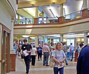 The 52,000-square-foot (4,800 m2) building houses a unique collection of records in almost completely open stacks. It holds 80,000 family history books, 100,000 local history items, 565,000 rolls of microfilm, and 7,000 maps. It also contains all available U.S. federal population census records and federal indexes, Civil War histories, immigration and naturalization records, ship passenger lists, Native American records, biographical archives, manuscripts pertaining to the American slave trade and the Antebellum South, Papers of the St. Louis Fur Trade, and a large variety of state records for Missouri and other states such as state censuses, tax records, penitentiary records, military service records, compiled records of Missouri Union and Confederate Army soldiers, approximately 50 Missouri newspapers, local newspaper indexes to obituaries and weddings, and genealogical periodicals.[8][9] The center also has 10,000 volumes available for circulation in the “Genealogy from the Heartland Collection” created from donations by the American Family Records Association (AFRA), Missouri State Genealogical Association (MoSGA), Heart of America Genealogical Society (HAGS), Gann Family Association, and patron contributions.[10]