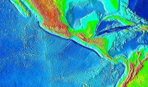 The Middle America Trench is a major subduction zone, an oceanic trench in the eastern Pacific Ocean off the southwestern coast of Middle America, stretching from central Mexico to Costa Rica. The trench is 1,700 miles (2,750 km) long and is 21,880 feet (6,669 m) at its deepest point. The trench is the boundary between the Rivera, Cocos, and Nazca plates on one side and the North American and Caribbean plates on the other. It is the 18th-deepest trench in the world. Many large earthquakes have occurred in the area of the Middle America Trench.[1]