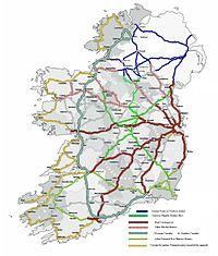 One of the most essential requirements that will ensure the successful operation of a Gateway is the provision of high quality transport infrastructure so as to provide the necessary levels of internal and external accessibility and mobility. Currently, the Gateway does not have direct access to complete Inter-Urban Motorways/Dual-Carriageways, both internally and externally. The Gateway, and in particular the three principal Gateway towns of Athlone, Tullamore and Mullingar, is served by main line inter-urban rail and bus networks, with direct access to urban centres of Dublin, Galway and Sligo, and limited local bus services. However, there is poor rail connection within the Gateway.[5]