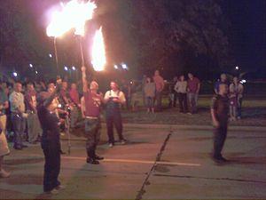 The first Midnight Yell was held in 1932. Two freshmen asked the senior Yell Leaders to hold a midnight practice so that students would be motivated for the upcoming football game against archrival Texas Longhorns.[1][2] The Yell Leaders said that while they liked the idea, they couldn't authorize a Yell Practice at that hour. However, they said that they just might "show up" at the campus YMCA Building that evening around midnight. The Fightin' Texas Aggie Band met them at the YMCA, and soon the bulk of the student body had gathered. The cadets used railroad flares to light the event, and a tradition was born.[1]