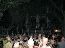Since that first Midnight Yell, the event has been held on the night before each home football game. The Fightin' Texas Aggie Band and the five Yell Leaders lead a parade from the Quadrangle, where the Corps dorms are located. Students and alumni line the route from the Quadrangle to Kyle Field, falling into line once those in front of them have passed. Students and alumni gather in the student section of the stands. At midnight, the yell practice begins.[1] The Corps Juniors used to guard Kyle Field all night against students from other schools who may try to pull pranks the night before the game. This job has since been taken over by University Police but only the Corps Juniors are allowed to stand on the track around the Field in recognition of this tradition.[2]