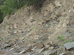 The coastal cliffs are Upper Devonian strata of grey sedimentary rock. They are composed of alternating layers of sandstone and shale, which are 350–375 million years old. The area today supports mainly birch, aspen, and fir forests.