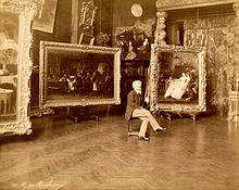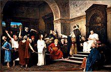 Sedelmeyer took these three huge paintings on tour across Europe and the United States. The first two were purchased by US department store magnate John Wanamaker. After Wanamaker's death they were exhibited in the Grand Court of his Philadelphia store every Easter, with special Lenten music programs often arranged around them. The spaciousness of the Grand Court favorably accommodated the paintings' heroic size. During other parts of the year they were kept in a special vault adjacent to the Wanamaker Organ. Wanamaker reportedly paid the highest price for its time ever paid to a living artist. For years the Hungarian government sought to gain ownership. When the store chain was bought by Michigan shopping-mall magnate A. Alfred Taubman, the popular paintings were quietly auctioned in 1988, Joey and Toby Tanenbaum bought Christ in front of Pilate, and they donated it to the Art Gallery of Hamilton (AGH) in 2002.[4] The AGH loaned it to the Déri Museum in Debrecen from 2002 until 2007, and again from 2009 until 2014. In 2009, all three were installed in a special wing of the Déri Museum. At that point, Ecce Homo! (1896) and Golgotha (1884) were respectively owned by the Hungarian state and by Hungarian-American art collector Imre Pákh.[5] After the painting was returned to Canada, the Hungarian government sought to purchase it outright and in February 2014, it bought the painting for $5.7 million.[6][7]
