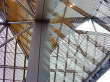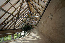 Mihoko Koyama and her daughter, Hiroko Koyama, commissioned the architect I. M. Pei to design the Miho Museum. I. M. Pei's design, which he came to call Shangri-La, is executed in a hilly and forested landscape.[14] Approximately three-quarters of the 17,400 square meter building is situated underground, carved out of a rocky mountaintop.[15] The roof is a large glass and steel construction, while the exterior and interior walls and floor are made of a warm beige-colored limestone from France – the same material used by Pei in the reception hall of the Louvre. The structural engineer for this project was Leslie E. Robertson Associates.