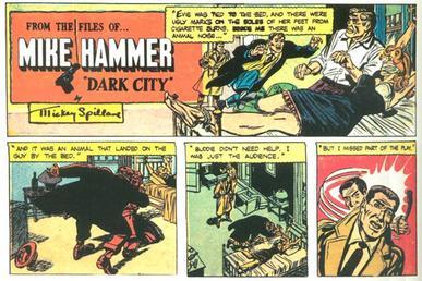 Walt Kelly wrote two parodies of Mike Hammer first published in collections of original work of his Pogo comic strip. They were: "The Bloody Drip - by Mucky Spleen" (Uncle Pogo So-so Stories, 1953) and "Gore Blimey - The Bloody Drip Writhes Again " (Pogo Peek-A-Book, 1955).