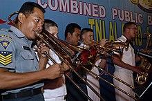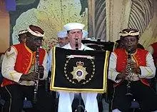 The Nigerian Army Band Corps (NABC), which provides official military records for the armed forces, is the most senior band in the Nigerian Army and in the armed forces. Other bands maintained by the Nigerian Armed Forces outside the NABC include the Nigerian Air Force Band, the Nigerian Navy Band, and the Nigerian Defence Academy Band.[18] The Nigeria Security and Civil Defence Corps Band also serves as a paramilitary band.[19] The Nigerian Navy Band was established in 1963 months prior to the country becoming a republic. The Air Force Band was the most recent military band established, being founded in 1970. Enlisted musicians only joined a year later, and did not have its first director of music until 1975. On 9 April 2019, the NAF graduated its first set of pipers from an air base in Abuja who would later comprise the newly formed NAF Pipe Band.[20] A pipe section can also be found in the Guards Brigade.[21] Steel pans were introduced in the late 70s, with the NABC beginning the process of manufacturing steelpans and was the only steel band in the country until 2001.[22][23] The Army School of Music in Ojo and the Navy School of Music in the Ota both provide musical instruction as it pertains to incoming musicians. In September 2019, Ibok Ekwe Ibas, the Chief of the Nigerian Naval Staff, announced plans for the Navy Directorate of Music to partner its foreign counterparts as well as the Music Society of Nigeria to improve its performances.[24]