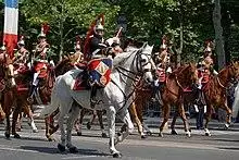 Like Cameroon and Niger, the Armed Forces of Senegal follows the French military band format in all of its musical formations. The Mounted Squadron of the Red Guard of Senegal, being the premier ceremonial unit of its 1st Infantry Regiment, maintains a 35-member mounted fanfare band similar to that of the French Republican Guard Cavalry. The mounted band leads the reset of the squadron in military parades and ceremonial processions in the capital of Dakar. Band musicians ride on white horses whose tails dyed red to match the official colors of the Red Guard.