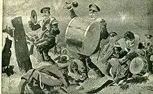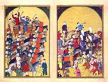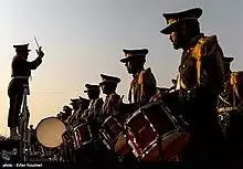 11th century book Divânu Lügati't-Türk mentions a prototype of the Mehtaran, as a "nevbet", Turkish military band tradition.[3] Bands were formed by soldiers.[4][5] 17th century traveler Evliya Çelebi noted that the Ottoman Empire had 40 guilds of musicians in the 1670s Istanbul.[6] Ottoman military bands influenced European equivalents.[7] Each regiment in the British Army maintained its own military band. Until 1749 bandsmen were civilians hired at the expense of the colonel commanding a regiment. Subsequently, they became regular enlisted men[8] who accompanied the unit on active service to provide morale enhancing music on the battlefield or, from the late nineteenth century on, to act as stretcher bearers. Instruments during the 18th century included fifes, drums, the oboe (hautbois), French horn, clarinet and bassoon. Drummers summoned men from their farms and ranches to muster for duty. In the chaotic environment of the battlefield, musical instruments were the only means of commanding the men to advance, stand or retire. In the mid 19th century each smaller unit had their own fifer and drummer, who sounded the daily routine. When units massed for battle a band of musicians was formed for the whole.[2]