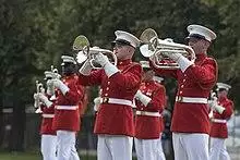 Brazilian military bands descend from the small unit bands of the Portuguese Army in what was then Colonial Brazil.[40] The last of these bands was the Band of the Brigada da Real da Marinha.[41] The Armed Forces of the Empire of Brazil kept this tradition alive through the 19th century. Military bands became more common from the 1840s on, expanding into services such as military corps and the National Guard.[41] Since the late 1940s, the Brazilian Marine Pipes, Drum and Bugle Corps uses brass (formerly bugles) and percussion instruments, as well as bagpipes and fifes. They represent both the Brazilian Marine Corps and the Brazilian Navy in all activities it participates. Its formation mirrors Portuguese and Italian military band traditions, as well as those of the United States drum and bugle corps of the early 20th century.