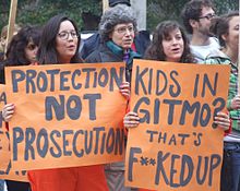 In the United States, prosecutors take a different view from David Crane and have repeatedly stated that they intend to try Omar Khadr, on several serious charges including murder, for offences they allege he committed in Afghanistan while fighting for the Taliban against United States forces while he was under sixteen years old. If found guilty under US law such a crime carries a maximum penalty of life imprisonment.[11] On 25 October 2010, Khadr pleaded guilty to murder in violation of the laws of war, attempted murder in violation of the laws of war, conspiracy, two counts of providing material support for terrorism and spying.[13][14] This was agreed as part of a plea bargain, which would see Khadr deported to Canada after one year to serve the remaining seven years there.[15] In a letter to the U.S. military commission at Guantanamo after the plea of guilty had been heard but before the announcement of sentence, Radhika Coomaraswamy, the UN secretary-general's special representative for children and armed conflict, wrote that Khadr represents the "classic child soldier narrative: recruited by unscrupulous groups to undertake actions at the bidding of adults to fight battles they barely understand", and suggested that Khadr to be released into a rehabilitation program.[16] Omar Khadr remained in Guantanamo Bay as of July 2012, and the Canadian government continued to face international criticism for their stonewalling of his repatriation.[17]