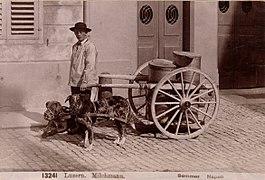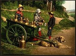 A photochrom from the late 19th century showing two peddlers selling milk from a dogcart near Brussels, Belgium