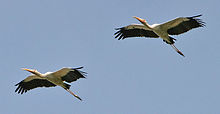 By the age of three months, the previously feathered head is now completely bald and the dull bill has become warm yellow with a greenish yellow tip.[4][13] Both features are characteristic of adults. Milky stork juveniles appear almost identical to painted stork juveniles,[14] but are said to be distinguishable from painted stork juveniles by their paler underwing lining contrasting with the completely black flight feathers, whereas this underwing lining is completely black in painted storks.[4]