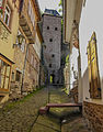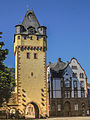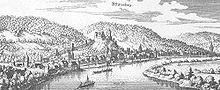 Miltenberg/Miltinburc grew around a Mainz toll station built on the river bank in the 13th century, protected by the Mildenburg (castle). The castle itself dates from the 12th century. In 1237, the village was awarded the status of town. It profited from the Stapelrecht which forced passing merchants to store their wares locally and offer them for sale for some days. This boosted construction of inns and warehouses.[2]:81 For protection, walls from the castle were extended around the town. This oldest part of the town was just 100 meters east to west, extending west from today's Schnatterloch. The first expansion of the settlement stretched east to the Mittelturm and west to the Schwertfegerturm (both later demolished). By the 14th century, the town had expanded to the limits which roughly endured until the 19th century: from Würzburger Tor (east) to Spitzenturm/Mainzer Tor (west).[3]:85