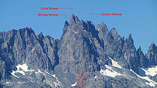 The peaks were named in 1868 by the California Geographical Survey, which reported: "To the south of Mount Ritter are some grand pinnacles of granite, very lofty and apparently inaccessible, to which we gave the name of 'the Minarets.'"[6] Seventeen of the Minarets have been given unofficial names, including Michael Minaret, Adams Minaret, Leonard Minaret, and Clyde Minaret. Clyde Minaret, named after Norman Clyde, is the tallest of the spires. The Southeast Face Route of Clyde Minaret is a technical rock climb featured in Fifty Classic Climbs of North America.[7]