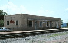 The Missouri-Pacific Railroad built the station in 1906. In 1951, as "modernization", the hipped roof was removed and decoration stripped from the station, leaving a rectangular brick building.[2]