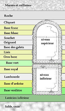 The most primitive mining technique was to extract a mineral where it could be seen on the surface, in places where millennia of erosion by the ancestors of the Paris basin's rivers Seine, Marne and Bièvre[4] exposed many levels of Paris' underlying stratification to open air. Minerals available from the surface, beginning with Paris' highest elevations in the valleys created by this erosion are: the plaster deposits in the upper reaches of the Right Bank hills of Montmartre and Belleville; lower in the valleys are sand and limestone deposits nearest the surface on Paris' Left Bank. The underlying clay strata were accessible from the surface in the lowest points of the Seine, Marne and Bièvre river valleys.