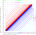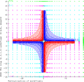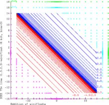 The graphic demonstrates the addition of even smaller (1.3.2.3)-minifloats with 6 bits. This floating-point system follows the rules of IEEE 754 exactly. NaN as operand produces always NaN results. Inf − Inf and (−Inf) + Inf results in NaN too (green area). Inf can be augmented and decremented by finite values without change. Sums with finite operands can give an infinite result (i.e. 14.0 + 3.0 = +Inf as a result is the cyan area, −Inf is the magenta area). The range of the finite operands is filled with the curves x + y = c, where c is always one of the representable float values (blue and red for positive and negative results respectively).