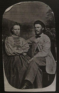 In 1865 she married her natural sciences teacher, Johan Ferdinand Canth (1835–1879), and had to drop out of the Seminary.[5] Between 1866 and 1880 she gave birth to seven children: Anni (1866–1911), Elli (1868–1944), Hanna (1870–1889), Maiju (1872–1943), Jussi (1874–1929), Pekka (1876–1959) and Lyyli (1880–1969);[6] her husband Johan died in 1879 shortly before the birth of the family's seventh child.[5] She began her writing career at the newspaper Keski-Suomi, where her husband worked as an editor. She wrote about women's issues and advocated temperance. In 1876 the Canths were forced to leave the paper because Minna's writings had roused some bad blood; they were, however, both employed by the competing Päijänne the following year. Minna published her first works of fiction on the pages of Päijänne: various short stories, which were compiled in her first book, Novelleja ja kertomuksia, in 1878.[2][7]