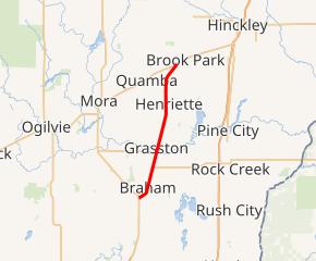 Highway 107 serves as a north–south route between Braham, Grasston, Henriette, and Brook Park. It is geographically located between the cities of Cambridge and Hinckley in east-central Minnesota and parallels Interstate 35 and State Highway 65 throughout its route.
