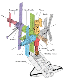 The Stykovochnyy Otsek (Russian: стыковочный отсек, English: Docking compartment), GRAU index 316GK, otherwise known as the Mir docking module or SO, was the sixth module of the Russian space station Mir, launched in November 1995 aboard the Space Shuttle Atlantis.[4] The module, built by RKK Energia, was designed to help simplify space shuttle dockings to Mir during the Shuttle-Mir programme, preventing the need for the periodic relocation of the Kristall module necessary for dockings prior to the compartment's arrival.[3] The module was also used to transport two new photovoltaic arrays to the station, as a mounting point for external experiments, and as a storage module when not in use for dockings.[1]