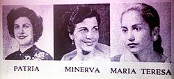 The Mirabal sisters (Spanish pronunciation: [eɾˈmanas miɾaˈβal], Las Hermanas Mirabal) were four sisters, known commonly as Patria, Minerva, María Teresa, and Dedé, who opposed the dictatorship of Rafael Trujillo (El Jefe) in the Dominican Republic and were involved in clandestine activities against his regime.[1] Three of the four sisters (Patria, Minerva, María Teresa) were assassinated on 25 November 1960. The last sister, Dedé, died of natural causes on 1 February 2014.[2]