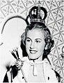 - Lady Rhinestone Crown or Coventry Crown (1961–2001) — This crown was purely made from rhinestones, debuting in 1961 as part of the 10th anniversary of the Miss Universe pageant. Only Marlene Schmidt from Germany and Norma Nolan from Argentina wore this crown.[25] In 1963, renowned jeweler Sarah Coventry reinvented the rhinestone crown which featured a female figure (holding a scepter) as its main centerpiece. The cheaper cost of its rhinestone design made it possible to create exact replicas of the crown to be given to outgoing titleholders. The design was slightly modified in 1973 for the wearer's convenience, and was dubbed as The Lady Crown. This was used until 2002, when Denise Quinones became its last crown holder before relinquishing her role as Miss Universe, and the Mikimoto Pearl company accepted the offer to sponsor a commemorative crown for the Miss Universe Organization during the same year's 50th overall edition for the pageant.[25]