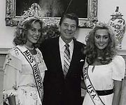 Shawn Weatherly, Miss Universe 1980 and Kim Seelbrede, Miss USA 1981 together with the then-US President Ronald Reagan.