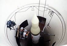 The German idea of an underground missile silo was adopted and developed by the United States for missile launch facilities for its intercontinental ballistic missiles. Most silos were based in Colorado, Nebraska, North Dakota, South Dakota, Missouri, Montana, Wyoming and other western states. The first missile launch facility was located in Jersey Shore, Pennsylvania, however there was a high school built on top of it in 1985. There were three main reasons behind this siting: reducing the flight trajectory between the United States and the Soviet Union, since the missiles would travel north over Canada and the North Pole; increasing the flight trajectory from SLBMs on either seaboard, giving the silos more warning time in the event of a nuclear war; and locating obvious targets as far away as possible from major population centres.[2] They had many defense systems to keep out intruders and other defense systems to prevent destruction (see Safeguard Program). In addition to the three previously-mentioned siting reasons, the US Air Force had other site requirements that were also taken into account such as, having the sites be close enough to a populace of roughly 50,000 people for community support along with making sure launch locations were far enough apart that a 10 MT detonation on or near strategic locations would not knock out other launch facilities in the area.[3] "In 1960 the US Army established the Corps of Engineers Ballistic Missile Construction Office (CEBMCO), an independent organization under the Chief of Engineers, to supervise construction".[3] This newly established organization was able to produce Minutemen Launch silos at an extremely fast rate of ~1.8 per day from 1961 to 1966 where they built a total of 1,000 Minuteman missile silos.[3]