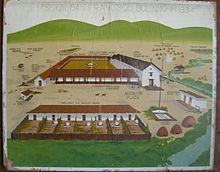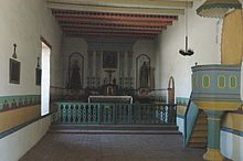 Fr. Gutierrez continued to build and increased the agricultural effort.[24] By 1832 the mission had 27 rooms in the convento or priest's quarters, with a great adobe church at the east end, and a wooden storehouse (the original mission chapel) at the west end. Completing this enclosure were workshops where the Indians were taught to be craftsmen and created the items needed to help the mission be self-sufficient. Along the back of the courtyard were the living quarters and workrooms for the young Indian girls. In addition to the quadrangle, there were orchards, gardens, vineyards, fields of grain, a gristmill, houses for the soldiers and Indian families, a jail, a cemetery, and an infirmary.[25]