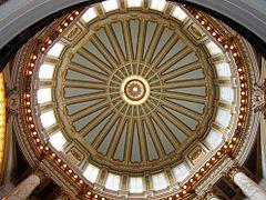 In 1933-34, a major painting program transformed the interior of the Capitol from its original white plaster ceilings to a much more colorful palette. This project, funded by the Civil Works Administration and overseen by Jackson architect A. Hays Town, included artwork in the domes of the Rotunda and the Senate Chamber.